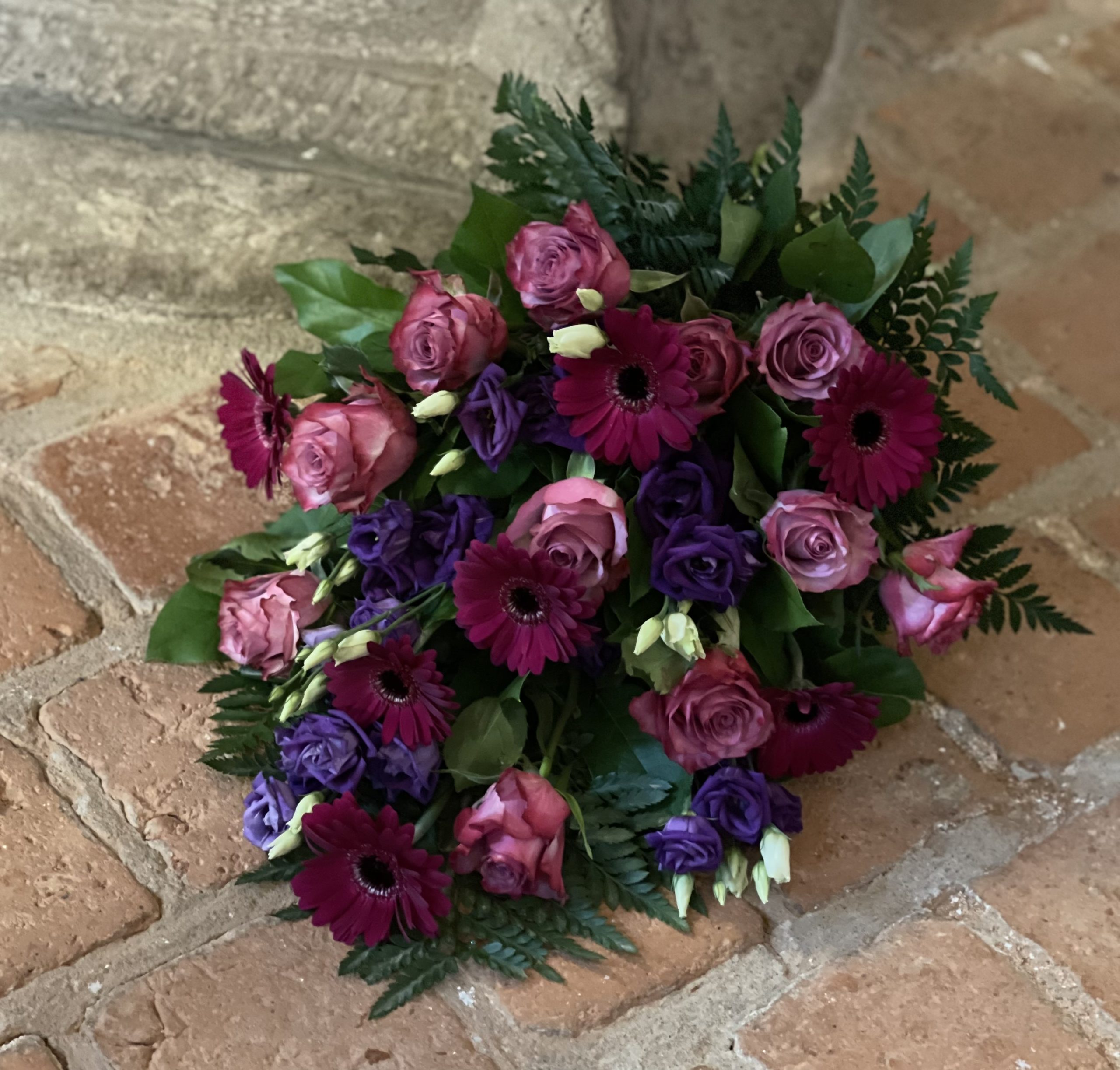 Begravningsbukett i cerise & lila toner.