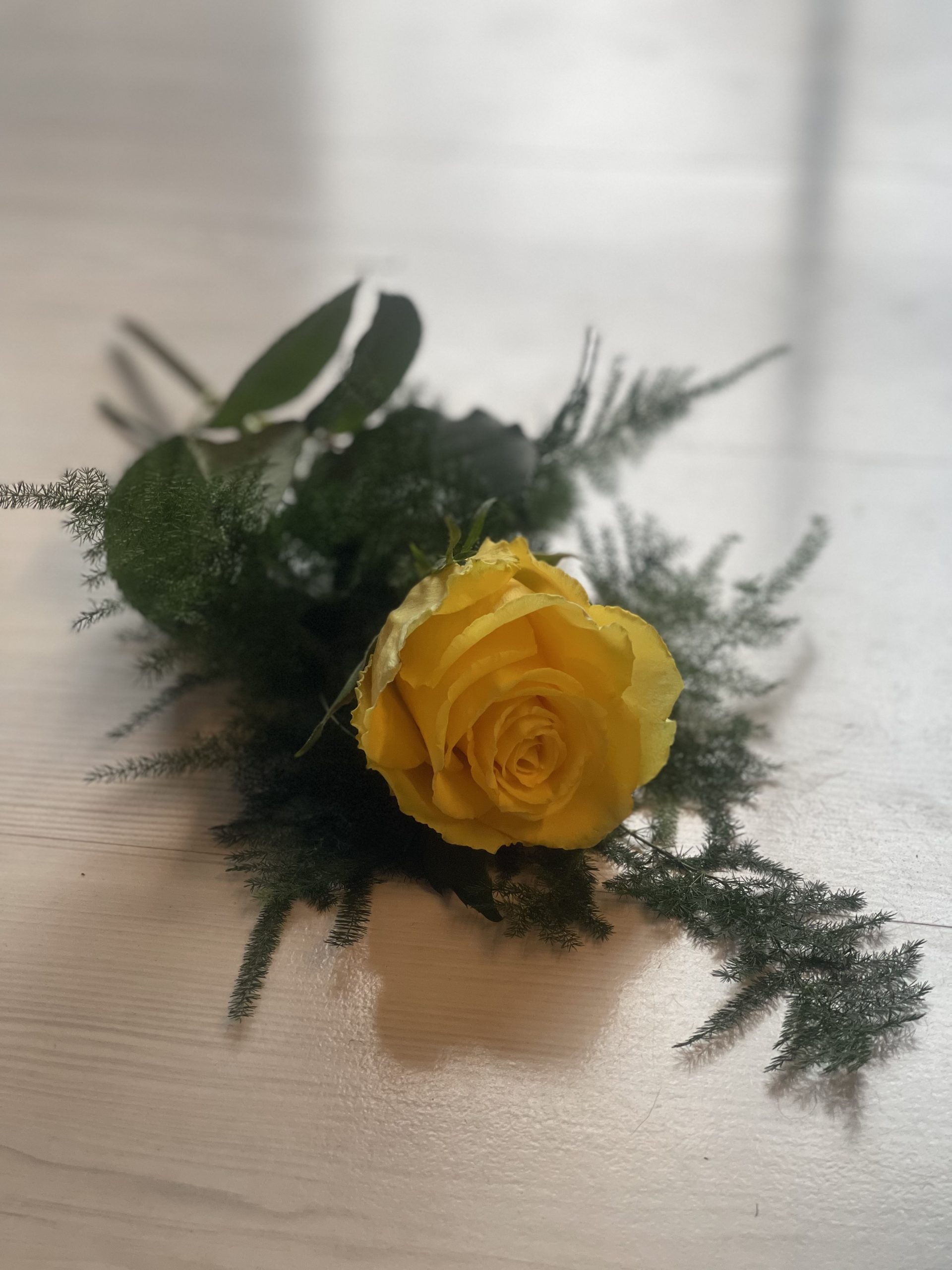 Handbukett gul ros med grönt.