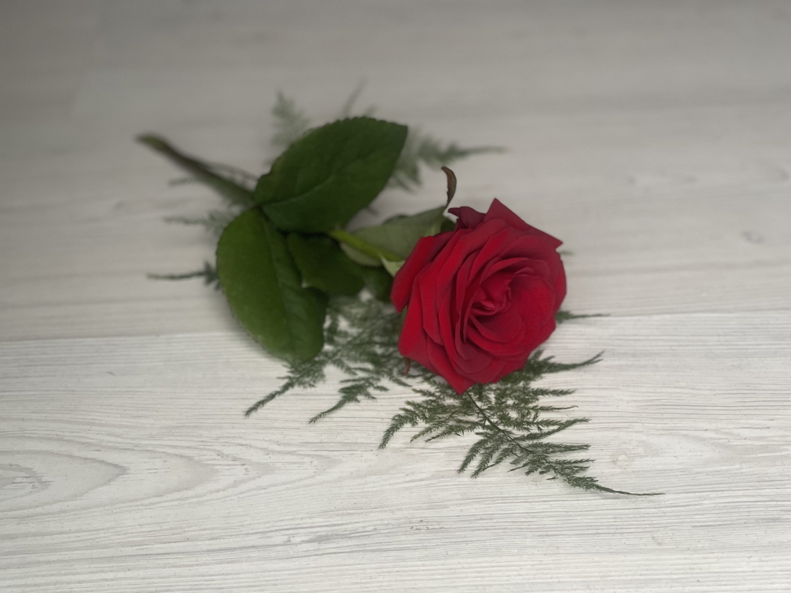 Handbukett ~ Röd ros med grönt